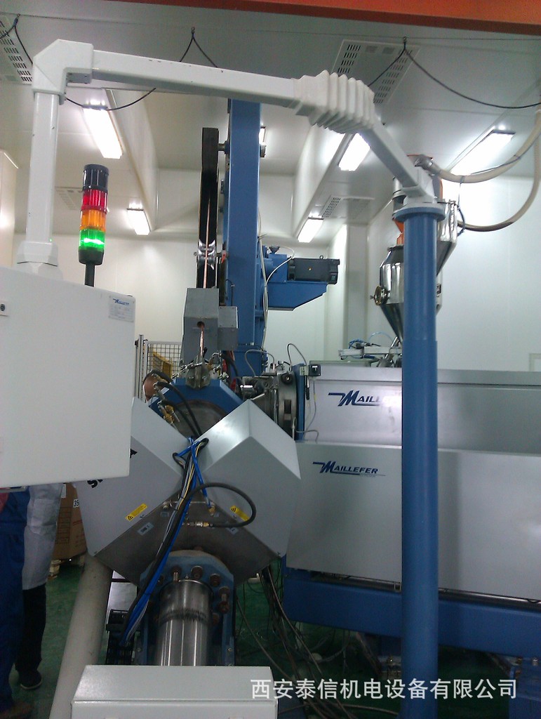 /铝导体经加热后,温度接近于挤出温度,使绝缘交联更趋均匀一致,提高了三层共挤材料对导体的包覆力,有效避免气隙。同时,导体预热器与十字机头一起使用,还可有效驱除导体内潮气,有利于改善绝缘品质和绝缘热应力。